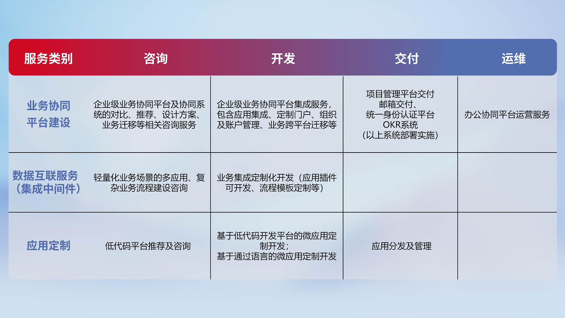 针对钉钉、、企微、、、、IDaas等平台级产品提供产品的规划、、、方案、、、交付、、定制化开发等服务,,,实现如统一协同办公、、、智能客户服务、、混合会议管理、、、、智能数据查询、、等业务场景,,,实现数字化转型。。