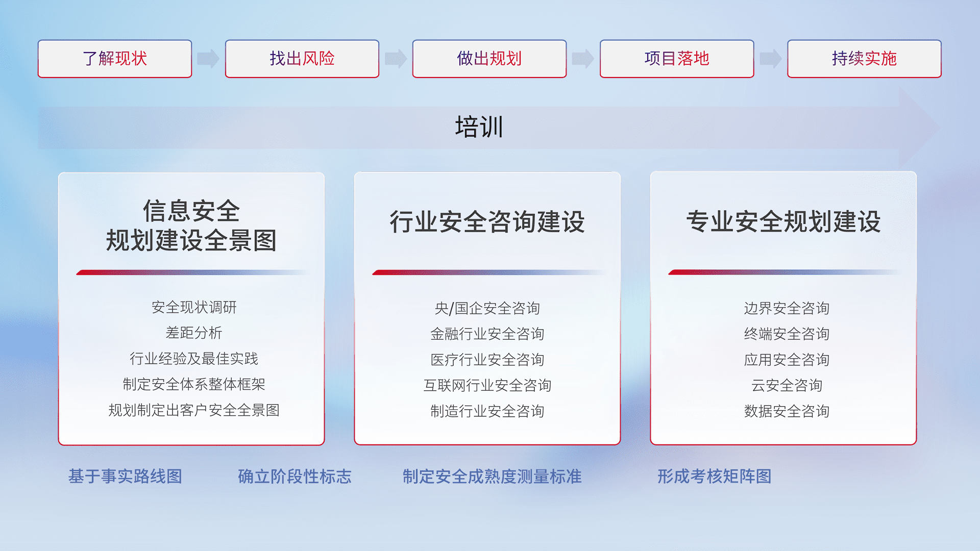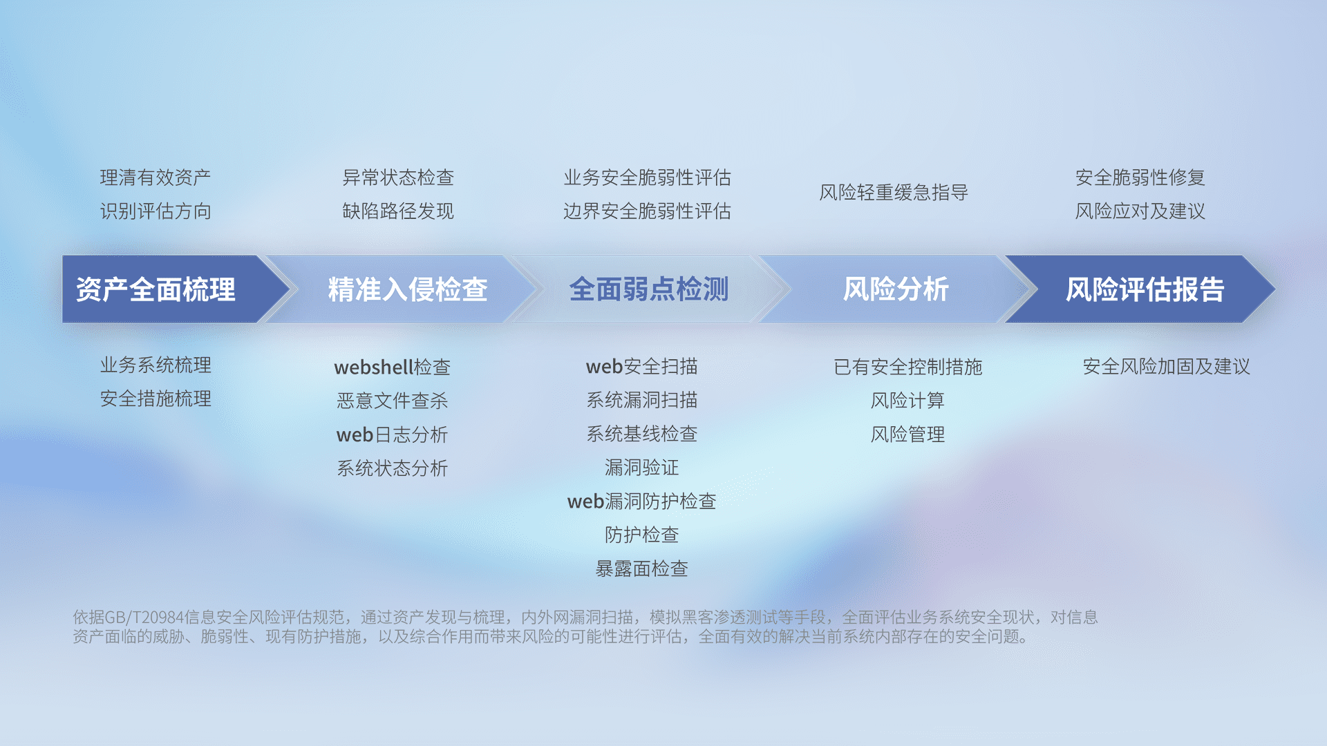 针对客户行业特性,,,以专业的安全服务+多厂商联合解决方案提供专属的一站式安全管理服务,,,,帮助客户全面感知网络空间威胁,,,基于识别、、、、检测、、、分析、、、防护、、、监测、、、响应的服务理论模型,,,,从方案咨询、、集成交付、、评估验证、、、优化加固、、、运维运营,,,,致力于为客户提供完整的闭环管理式安全服务。。以实战经验为客户打造高抵御风险的安全体系,,帮助客户发现威胁、、、、对抗威胁、、、、处置威胁,,,不断积累安全对抗能力,,,,持续保障数字化安全。。